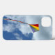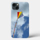 Morto em quatro cores. A pipa em forma de diamante está voando em nuvens. Listras vermelhas, amarelas, verdes e azuis na pipa.