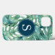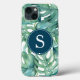 Esta capa de telefone de monograma apresenta folhas tropicais de cor aquosa em tons de verde, com a sua inicial personalizada em branco sobre um fundo azul marinho. trabalho de arte de folha de palma de água monstera e design de Victoria Grigaliunas. Para ver mais capas de telefone de praia como esta, visite www.zazzle.com/dotellabelle