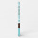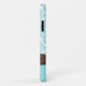 Este moderno, personalizado, azul-aqua e branco damask Case-Mate iPhone 11 Case com uma fita impressa marrom de chocolate e broche de joia tem um ponto para você adicionar seu nome e monograma.