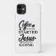 Esta capa de telefone apresenta uma design de tipografia de citação cristã em um roteiro preto moderno que diz "Café me dá início Jesus me deixa indo". Carregar seu telefone em estilo. De nossos corações aos seus, aproveitem!