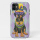 O filhote de cachorro bonito do Pinscher do Doberman, vestido na máscara festiva, chapéu do bobo da corte e miçanga, apronta-se para o divertimento no carnaval ou em qualquer outro momento. Grande presente para o senhor mesmo e seus família e amigos Dobe-loving.