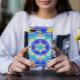 Esta design de flor de mandala funky apresenta azul, amarelo e rosa no estilo de desenho animado. Visuais geométricos triplos para o hippie moderno ou amante de cores vibrantes!