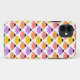 Esta capa de telefone tem um design de conflituosos espalhados sobre o design em amarelo, laranja, rosa e roxo num campo de branco.