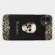 Esta Capa de telefone Personalizada na moda apresenta um crânio Gótico branco com ornamentos de ouro sobre um fundo preto. As fontes de estilo Vintage adicionam aparência autêntica a este design de estilo gótico. Personalize com seu nome. A cor de fundo é personalizável.
