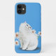 Gato persa branco e bonito com flor margarida branca em fundo azul. A cor de fundo pode ser alterada.