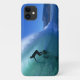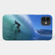 O caso do iPhone 11 é mostrado com uma impressão de foto de um surfista que está cavalgando a onda. Personalizar ou comprar como está. Imagem do stock