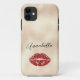 Esta capa de telefone glamourosa e feminina personalizada apresenta um fundo de folha de ouro de champanhe. Uma imagem de lábios brilhantes vermelhos é colocada no centro. Um nome de exemplo é impresso acima dos lábios em uma fonte de script elegante. Você pode personalizar a capa de telefone e adicionar seu próprio nome personalizado ou texto.
