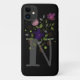 Design apresenta Monograma mais Flores num Design Floral. Inicial é a letra N. Capa de telefone preta.