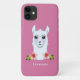 Llama desenho e flores em capa de iPhone rosa dourado. O texto pode ser personalizado.