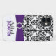 Maleta de cor damasco branca, roxa e roxa personalizada; Mate-maleta de iPhone 5 com fita impressa e broche com joalharia.
