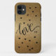 Monograma Dourado com Love Apple iPhone 11Case desenhado com um fundo Dourado Faux e decorado com uma dispersão de corações negros. O texto inclui seu Monograma e Amor. Para personalizar com suas iniciais, basta substituir o texto de amostra usando nosso modelo fácil. Faz um presente de Natal excelente.