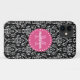 Cor damasco floral branca e cinzenta em preto e branco com uma estrutura de etiqueta cor-de-rosa com pontos brancos, letra inicial de monograma personalizada e nome personalizado. Um presente elegante e personalizável para uma menina ou mulher que ama padrões geométricos elegantes que são personalizados.