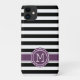Um padrão de listras chic, trendy, elegante, preto e branco com um modelo de monograma floral roxo.