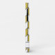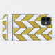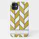 O gabinete personalizado iPhone 11 apresenta um design de chevron elegante com um padrão geométrico herringbone em falso brilho dourado, preto e branco.