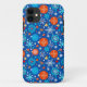 Fundo azul vibrante preenchido com vários elementos decorativos associados ao inverno e celebrações festivas. Destacam-se ornamentos coloridos, principalmente em tons de laranja, azul e vermelho, adornados com intrincados desenhos de flocos de neve e listras. Além disso, vários flocos de neve de diferentes formas e tamanhos estão espalhados por toda parte, juntamente com pequenos círculos em cores contrastantes, adicionando à atmosfera festiva. O efeito geral é lúdico e alegre, evocando um sentimento de espírito natalino.