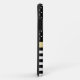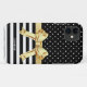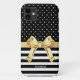 capas de iphone na moda, com padrão de bolinhas preto e branco, na parte superior da caixa e fundo listrado preto e branco, na parte inferior. Gráficos de uma fita e um arco dourados bonito atravessam o gabinete entre os dois fundos. O texto personalizado branco, na metade inferior, está pronto para personalizar. Bonito maneira de proteger seu dispositivo e parecer na moda, e faz uma ideia personalizada de presente de excelente.
