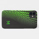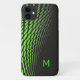 Capas de iphone moderna feita a preto com um padrão de pontos em cascata verde neon e um monograma de letras solteiros. Personalize o inicial para você mesmo ou como uma ideia de presente de excelente.