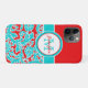 Este gabinete de cor damasco floral moderno, personalizado, azul-turquesa, vermelho e branco, Mate-maleta de lá™ iPhone 11, tem pontos para você adicionar seu nome, iniciais, monograma ou outro texto. Se precisar de ajuda para personalizar isto, envie um email para niteowlstudio@gmail.com.
