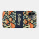 Capa de telefone personalizada com uma ilustração de cogumelos retrorreflectores, flores vintage em cores antigas de azul escuro, laranja e bege.
