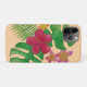 Um lápis de aquarela desenhando uma flor rosa tropical com folhas verdes.