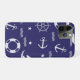 Fundo Padrões Azuis Marinho Azuis Sem Costura. Este design decorativo apresenta uma âncora azul marinho escura e uma roda de barco com cinzas e listras brancas. A ilustração náutica cria chinelos modernos e únicos com texto personalizado e cor de fundo.