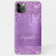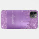 Capa de telefone elegante e giro personalizada, com brilho púrpura e brilhante sobre um fundo de película metálica falso púrpura. Personalize com seu nome em um roteiro branco de tendência de na moda com baloiços.