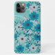 Uma capa de telefone com padrão floral sobre fundo azul claro. O padrão é constituído por flores azuis e brancas com centros escuros, folhas verdes e bagas pequenas rosa. As flores são dispostas de forma densa, sobreposta, criando um design rico e texturizado. A capa de telefone tem um acabamento brilhante, e as lentes da câmera são visíveis no canto superior esquerdo. O estilo geral é feminino e decorativo, com foco em elementos naturais. A paleta de cores é macia e calmante, com um equilíbrio de tons legal e quentes.