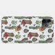 Esta festiva capa de telefone de Natal apresenta um padrão de ilustrações ocidentais desenhadas à mão de um pinho com botas de vaqueiro, chapéu de vaqueiro, amoras ocas, cactos e ornamentos de Natal vintage entre as estrelas e as palavras escritas à mão, "Howdy Christmas". Fundo branco elegante.