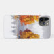 Uma ilustração do outono de um vasto fundo branco de neve com as silhuetas de montanhas e árvores à distância. As montanhas e árvores se esticam muito no horizonte, criando uma atmosfera serena e tranquila. O chão está coberto de laranja e folhas amarelas vibrantes, adicionando um pop de cor à cena.