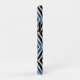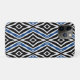 Um padrão abstrato azul, branco e preto caracterizado por formas dinâmicas de diamante entrelaçadas e sobrepostas, criando uma composição visualmente impressionante e moderna.