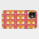 Essa capa de telefone tem um design geométrico de L's em vermelho, laranja e amarelo, colocado em diferentes direções num campo de branco.