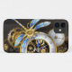 Marcações antigas com engrenagens de ouro e latão, decoradas com libélula mecânica sobre fundo castanho e listrado. Steampunk.