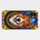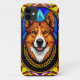 Trabalho de arte digital representando um cão num estilo de vidro manchado com cores vibrantes, correntes douradas e um pano de fundo estrelado de temática celeste. A intrincada design captura uma representação artística vívida e imaginativa.