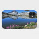 Flores cor-de-rosa no penhasco rochoso pelo lago azul