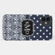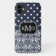 Cor damasco e bolinhas florescentes em branco e marinho azul com trio personalizado de iniciais para o seu primeiro, último e médio nome. Bonita e elegante trendy girly três design de monograma. Legal presente para as meninas que querem um presente personalizado que apresente suas três cartas iniciais.