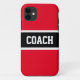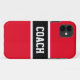 Dentro de letras fortes em negrito com uma faixa preta larga realçada com listras brancas em um fundo vermelho brilhante com "COACH" soletrado em frente e no centro. O texto pode ser personalizado.
