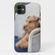 Welsh terrier se posando em uma cadeira branca mais velha.
