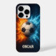 Um design temático de futebol que exibe uma bola de futebol a irromper por uma colisão de fogo e gelo. Você pode personalizar este design com um nome ou qualquer texto de sua escolha. Lembre-se de excluir o texto antes de adicionar o seu.