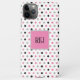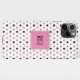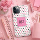 Bonito e giro, esta capa de telefone barato apresenta bolinhas rosa, pretas e cinzas sobre um fundo branco. No centro está uma caixa com um modelo para inserir as suas iniciais. Personalize o seu hoje!
