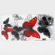 Bando de borboletas voadoras, realistas, vermelhas e pretas em fundo branco com gotas de tinta.
