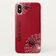 Capas de iphone temática Viúva Negra, feita em vermelho, com gráficos de teias brancas e aranhas negras. Personalize o texto preto para ler o que você quer ou deixar como Viúva Negra.