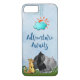 Uma capa de telefone que diz que aventura aguarda. Colocado sobre um fundo de aquarela azul claro. Uma nuvem azul e um sol laranja sentam-se no céu. Um meerkat, gorila e hipopótamo juntos em algumas gramíneas savanas, prestes a embarcar em alguma aventura.
