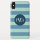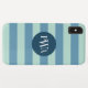 Vestir-se e proteger seu iPhone com um padrão listrado clássico no estilo marinho com um elemento design circular redondo que é personalizado com suas iniciais de primeiro, meio e sobrenome em uma fonte na moda Serif. Cores azuis marinhos.