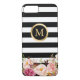 Decore seu iPhone no estilo com este "caixa listrada branca personalizada do preto dourado floral do monograma do círculo"!
