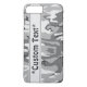Mala inteligente de padrão de camuflagem em cinzas urbanas com campo de texto editável. Personalizar com até 15 letras, números ou símbolos. Disponível para os modelos mais recentes de iPhone e Galaxy.