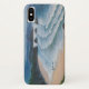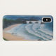 A pintura retrata um dia nebuloso e nublado na costa, com ondas rítmicas chegando à praia.