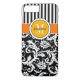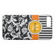 Este gabinete personalizado iPhone 7 preto e branco Mate-gabinete tem um padrão de fundo damasco e listrado floral com uma banda e círculo cor de laranja, amarelo-mostarda e branco para adicionar seu nome, iniciais, monograma ou outro texto. Este novo caso moderno e moderno faz uma declaração chic para o jovem motista da quadra! Se precisar de assistência, envie um email para niteowlstudio@gmail.com.