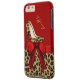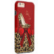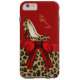 O gabinete do iPhone 6 Plus fascinável é feito em vermelho, na parte superior e um impressão pintado de onça marrom e preto, na parte inferior. Gráficos de uma fita de cetim vermelho e arco decoram o meio e um par de calcanhares de impressão aguares estão na metade superior. Personalize o texto bronzeado para você mesmo ou como uma ideia perfeita de presente.
