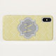 Um padrão de redimensionamento arquitetado deco-amarelado mal existe iPhone X Case com um crachá de quatrefoil de cinza mole que você pode personalizar adicionando facilmente seu próprio monograma e nome. Esta é parte da Coleção de Primavera de Monograma de Mist Monograma de Meadowlark Scallops.