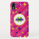 Este cobrir de caixa de célula rosa quente tem padrões coloridos de círculos aleatórios que são sobrepostos por linhas tracejadas diagonais em amarelo brilhante, laranja, roxo, verde, burgundy, marinho, azul claro e branco. Personalize o círculo branco e laranja com seu nome, iniciais, monograma ou outro texto. Faça o círculo e o nome tão grande ou pequeno quanto quiser, ou remova-o completamente.